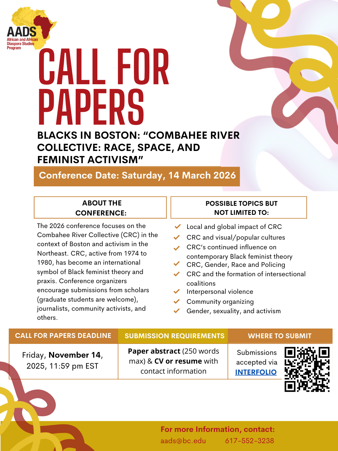 The 2026 conference will focus on the Combahee River Collective (CRC) in the context of Boston, MA and activism in the Northeast. The Collective, active in Boston from 1974 to 1980, has become an international symbol of Black feminist theory and praxis. The Collective’s international influence is undeniable, yet this renown has largely overwhelmed its Boston origins. This conference aims to return the Collective to its geographical and liberatory roots. Conference organizers encourage submissions on all topics relating to the CRC, including but not limited to the following themes: